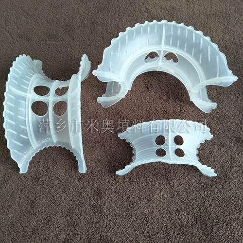塑料異鞍環(huán)是20世紀(jì)70年代美國Noton公司對普通矩鞍環(huán)填料作出了改進(jìn),其特點(diǎn)是將扇形弧面改進(jìn)成帶鋸齒邊緣的貝殼狀弧面,并在鞍背上增加了開孔,這樣填料層內(nèi)的通道更加通暢,改善了液體分布性能,降低了氣體通過的阻力,提高了傳質(zhì)性能。塑料異鞍環(huán)鞍形填料類似于馬鞍形狀,這種填料層中主要為弧形的液體通道,填料層內(nèi)的空隙較環(huán)形填料(尤其較拉西環(huán)填料)更加連續(xù)。